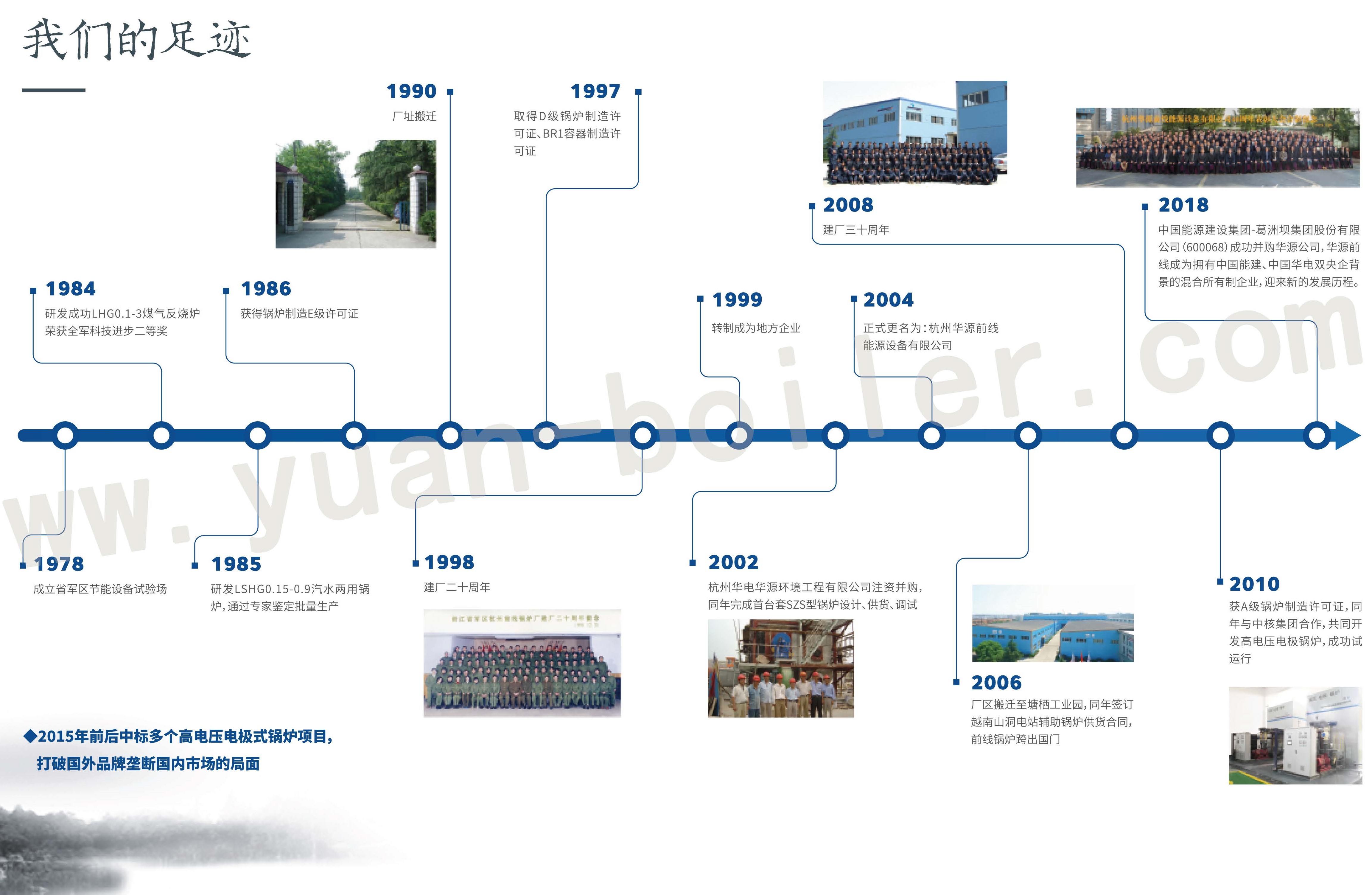 杭州華源前線能源設備有限公司(原杭州前線鍋爐廠)創建于一九七八年,原為解放軍總后勤部第九零八四工廠,1999年轉制到地方。公司控股股東杭州華電華源環境工程有限公司為中國葛洲壩集團(中國能源建設集團)與華電電力科學研究院(中國華電集團)雙央企聯合控股企業。廠區坐落在杭州市塘棲工業園,屬國家高新技術企業、浙江省熱能設備技術企業研究開發中心。持有A級鍋爐制造許可證,壓力容器制造許可證、美國ASME鍋爐及容器設計制造證書、電氣CCC強制許可資質、歐盟CE認證、印度IBR認證;已通過GB/T19001-2016/ISO9001:2015質量管理體系、GB/T24001-2016/ISO14001:2015環境管理體系、GB/T28001-2011/OHSAS 18001:2007職業健康安全管理體系認證。依托國家級科研院所雄厚的研發、設計等綜合實力,我司是國內最早成功研發快裝鍋爐技術的鍋爐制造企業,是快裝鍋爐國家火炬計劃示范承擔單位。先后在電站輔助鍋爐、電極鍋爐等產品獲得專利30余項,自有的鍋爐自控軟件版權3項。
