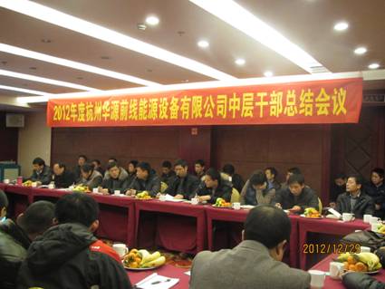 2012年12月29--30日,源牌集團杭州華源前線能源設備有限公司2012年度中層干部總結會議在西港酒店召開。公司全體中高層管理人員、車間班組項目經理與質量管理小組成員共46人參加了總結會議。