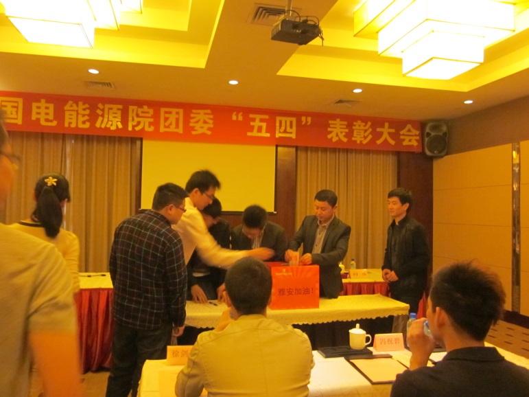 源牌集團五四表彰總結大會在集團公司領導的支持和集團公司黨委的關心下于2013年4月25日在海外海賓館舉行。出席本次活動的領導有:杭州市直機關團工委書記蘇學卿、國電能源院黨委副書記鄭喜梅、國電能源院團委書記付樂。表彰大會前,由主持人倡議對于4月20日8時2分在四川省雅安市蘆山縣發生7.0級地震中的遇難同胞表示哀悼,全體起立默哀三分鐘,并進行捐款。
