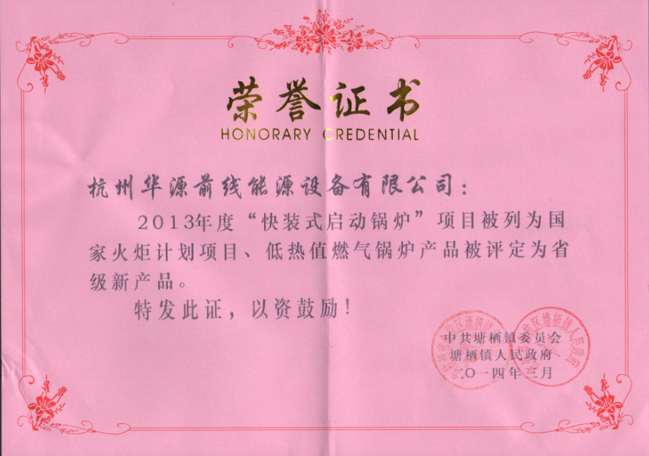 近日,杭州華源前線能源設備有限公司榮獲2014年度浙江杭州塘棲鎮“重點骨干企業”的榮譽等稱號。在全球經濟環境不景氣的2013年,我們用辛勤的汗水和智慧取得了重要業績,團結一致,披荊斬棘,努力拼搏,如期完成了2013年公司各項經濟指標。勇敢的華源人用智慧與汗水,又一次成功挑戰了2013年,迎來了充滿朝氣的2014! 與此同時,“快裝式電站輔助鍋爐”項目成功列入2013年度國家火炬計劃,獲得由科技部火炬高技術產業開發中心頒發的國家火炬計劃產業化示范項目證書,同時獲得政府獎勵資金。低熱值燃氣鍋爐產品被評定為省級新產品,由中共塘棲鎮委員會塘棲鎮人民政府頒發了榮譽證書,以資鼓勵。 回顧過去的一年里,我們在風雨中成長,在磨礪中進取。我們欣喜,我們感動,我們前進,我們更有毅力去戰勝一切艱難困苦,在我們面前的路雖然艱辛和曲折,但是我們有足夠的信心視這些為下一個奮斗的里程碑!