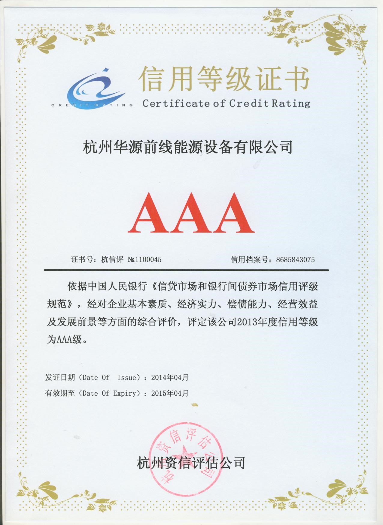 日前,杭州華源前線能源設備有限公司順利通過了銀行AAA級(以下簡稱3A)信用等級審核,至此,我司已連續好幾年被評為3A級信用企業。 企業銀行信用等級是銀行對企業信用資質綜合評價的一套體系,其中3A等級為企業信用評級的最高等級,只有資信優良、資產質量優良、經濟效益高、支付能力強、具有良好發展前景和廣闊成長空間的企業才能獲取最高等級的評定。 此次公司能夠獲取3A信用等級,充分證明了專業金融機構對我司的資產、信用和風險承擔能力的認可,公司的社會公信力和企業實力再獲銀行肯定。 3A信用等級證書的獲取將為公司的金融業務帶來諸多便利,為投標工作增加優勢與可信度,它不僅象征著公司社會信譽的提升,也對公司開拓市場、參與激烈的市場競爭,實現規模與效益同步增長起到積極的促進作用。