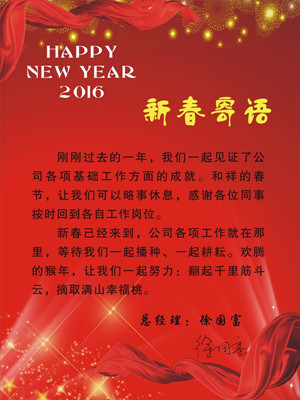 早上鬧鈴一響,又見廠旗飄揚(yáng)。2016年2月15日,這是春節(jié)假期后的第一個(gè)工作日,源牌集團(tuán)杭州華源前線能源設(shè)備有限公司的各位同事重返工作崗位,懷揣著愉快的心情,祝福我們的團(tuán)隊(duì):開工大吉…… 一早,源牌集團(tuán)黨政聯(lián)席會(huì)領(lǐng)導(dǎo)鄭喜梅、陳永林、趙希樵、許國(guó)文等一行,來到源牌集團(tuán)各部各子公司拜年。華源前線董事長(zhǎng)蔣聞文與總經(jīng)理徐國(guó)富陪同,親切走訪慰問華源前線的每一位員工,與大家親切交談、一一握手。一句簡(jiǎn)單的新年好,表達(dá)著領(lǐng)導(dǎo)班子對(duì)全體工作人員的問候與祝福。華源前線總經(jīng)理徐國(guó)富也發(fā)表新春寄語(yǔ),從即日轉(zhuǎn)入工作模式,以飽滿的熱情迅速投入到新一年的工作中。