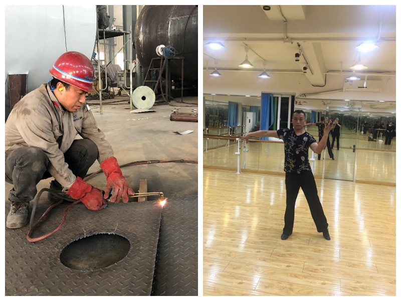 穿上工作服,他細心專注在火花閃耀的車間,腦海里只有圖紙、焊接要領;換上舞衣,他是熱情洋溢、光芒四射的舞者,耳中聽著的只有音樂、節拍。