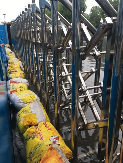 A 生產(chǎn)部積極組織人員,在廠區(qū)北門(mén)用沙袋進(jìn)行封堵,防止因地勢(shì)低洼造成水流倒灌進(jìn)入廠區(qū):