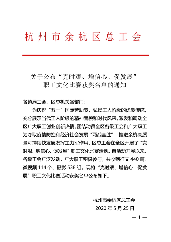 “五一”國際勞動節期間,余杭區總工會在全區開展了“克時艱、增信心、促發展”職工文化比賽活動。華源前線總經理工作部副經理陸怡代表公司投稿的攝影作品“抗擊防疫”在538組攝影作品脫穎而出,榮獲“優勝獎”。 華源前線始終以謹慎的態度面對疫情,以科學的措施防控疫情,以堅定的信心保障生產,以飽滿的熱情不懈奮斗!