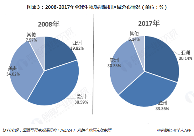 從全球生物質能裝機容量分布區域來看,2008-2017年全球生物質能裝機規模持續增長的主要動力來自于亞洲地區尤其是中國生物質發電市場的快速發展。具體表現為:2008年全球生物質能裝機容量為53.59GW,其中歐洲國家有20.68 GW,全球占比38.59%;美洲國家18.23 GW,全球占比34.02%;亞洲國家10.62 GW,全球占比19.82%。2017年全球生物質能裝機容量為109.21GW,其中歐洲國家有36.44 GW,全球占比33.36%;美洲國家33.15 GW,全球占比30.35%;亞洲國家32.92GW,全球占比30.14%。