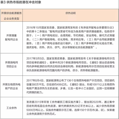 同時,“煤改氣”和“煤改電”政策的推行對供熱企業(yè)帶來了強烈沖擊。截至目前,進軍綜合能源服務(wù)的電力及燃?xì)獾绕髽I(yè)對供熱企業(yè)的沖擊已經(jīng)開始顯現(xiàn),具體見表2。