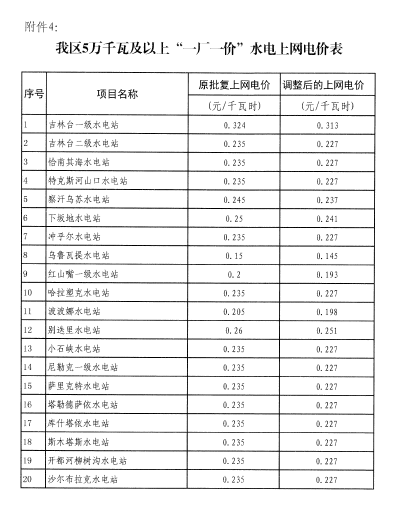 《通知》規(guī)定,因水電增值稅稅率降低至13%,相應(yīng)調(diào)整新疆5萬千瓦及以上水電上網(wǎng)電價。水電標(biāo)桿上網(wǎng)電價(含稅)調(diào)整為0.227元/千瓦時,南疆三地州(另含烏什縣、柯坪縣、阿瓦提縣)調(diào)整為0.251元/千瓦時。同時,自治區(qū)發(fā)展改革委原批復(fù)的5萬千瓦及以上“一廠一價”的水電上網(wǎng)電價相應(yīng)進行調(diào)整。
